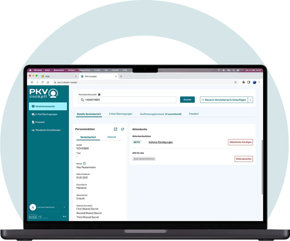 Das PKV-Cockpit bietet eine intuitive, übersichtliche Benutzeroberfläche für die Sachbearbeitung und Administration. Private Krankenversicherungen steuern ihre Prozesse in der TI 2.0 effizient und sicher -- auch ohne direkte Systemanbindung.